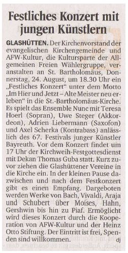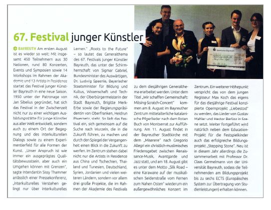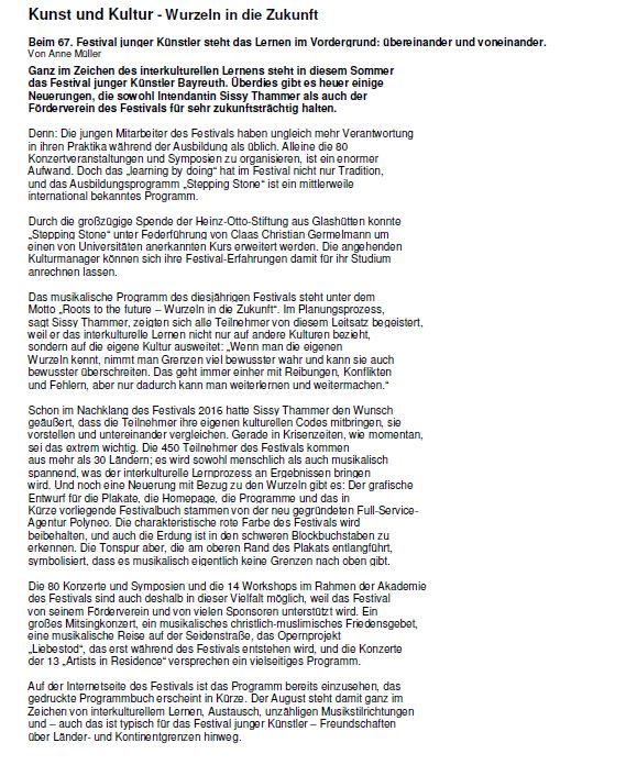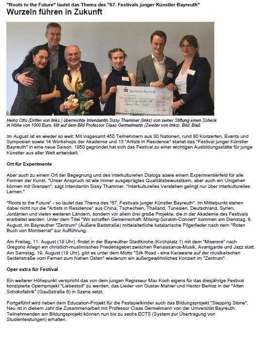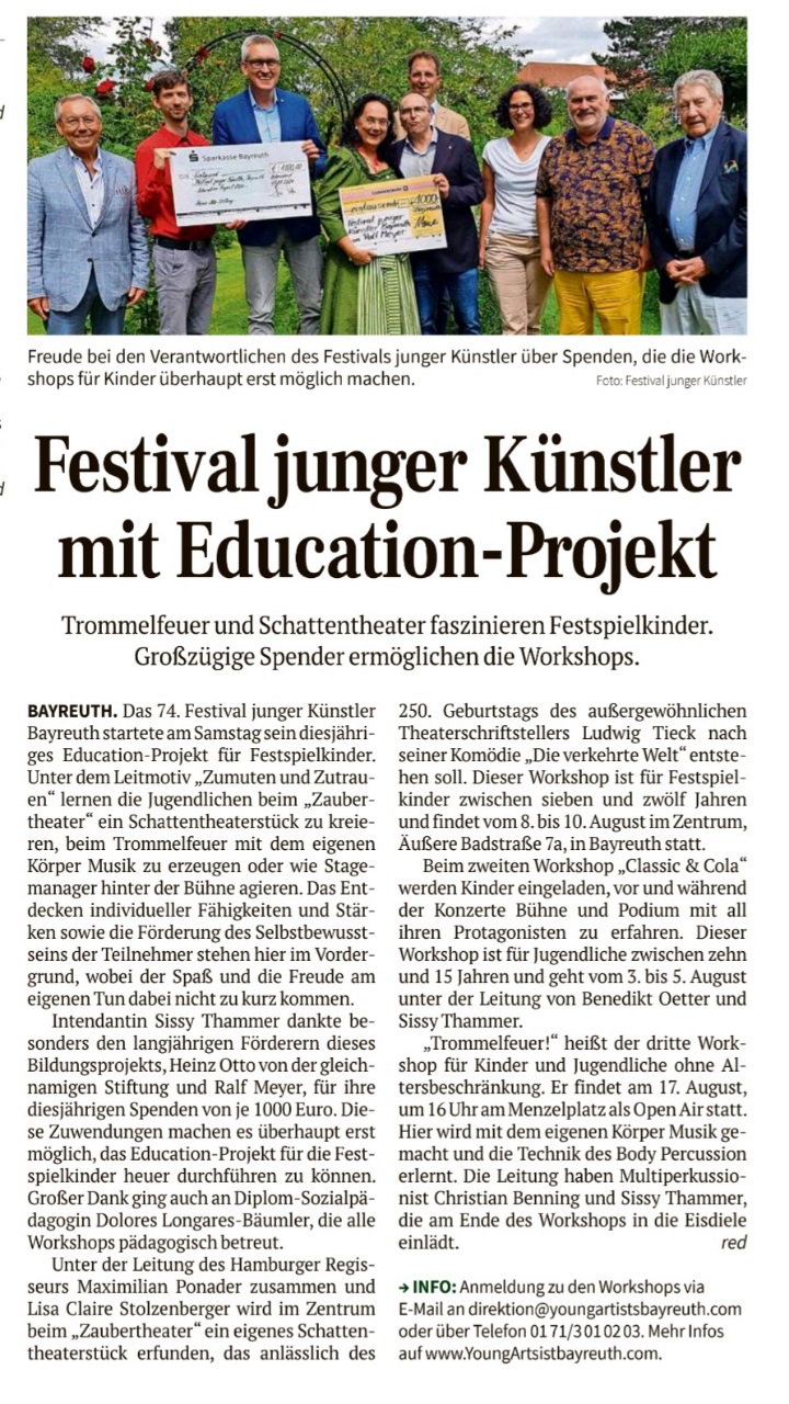 "Festival junger Künstler startet" veröffentlicht am 22.07.2018 in der Bayreuther Sonntagszeitung