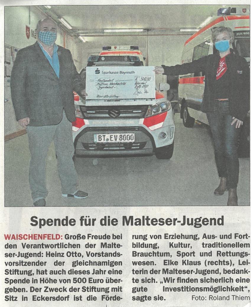 "Spende für die Malteser-Jugend" veröffentlicht am 14.10.2020 im Nordbayerischen Kurier